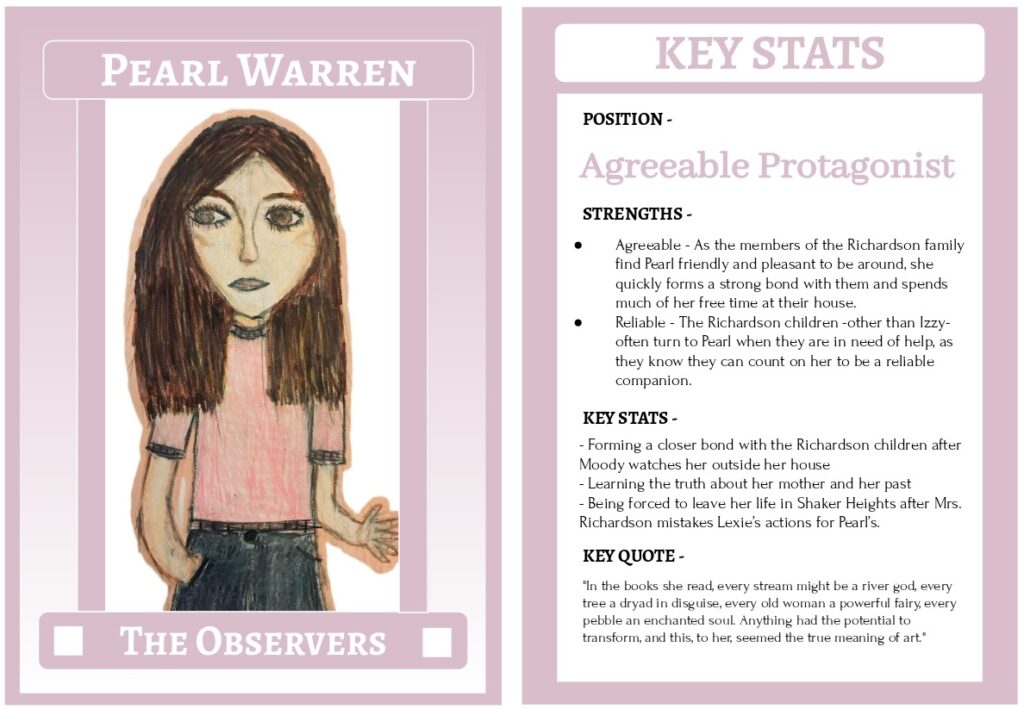 After years of constantly moving to pursue her mother’s art career, Pearl arrives at the Richardson’s rental house in Shaker Heights. Over time, Pearl and Mia become close with the Richardsons, causing the two families to become very dependent on one another. However, as Pearl becomes closer with the oldest Richardson children, Izzy—the youngest—becomes intrigued by Mia, Pearl’s mother. As Izzy begins to spend more time at the Warren’s house in Mia’s company, she imagines a life in which she is Mia’s daughter rather than Pearl. Pearl herself has become increasingly comfortable with the elegant lifestyle of the Richardson’s, and she also begins to picture living with their ideal conditions. After an unfortunate misunderstanding, however, the Warrens are forced to vacate their house in Shaker Heights, causing Mia to reveal her complicated past to Pearl. Izzy, feeling that the situation is incredibly unfair, sets her house on fire before disappearing from her home. Although the Warrens can only live briefly alongside the residents of Shaker Heights, Pearl’s and Izzy’s glimpse into a life they never had causes them to contemplate their experiences in the home they both left, and will continue to long into the future.