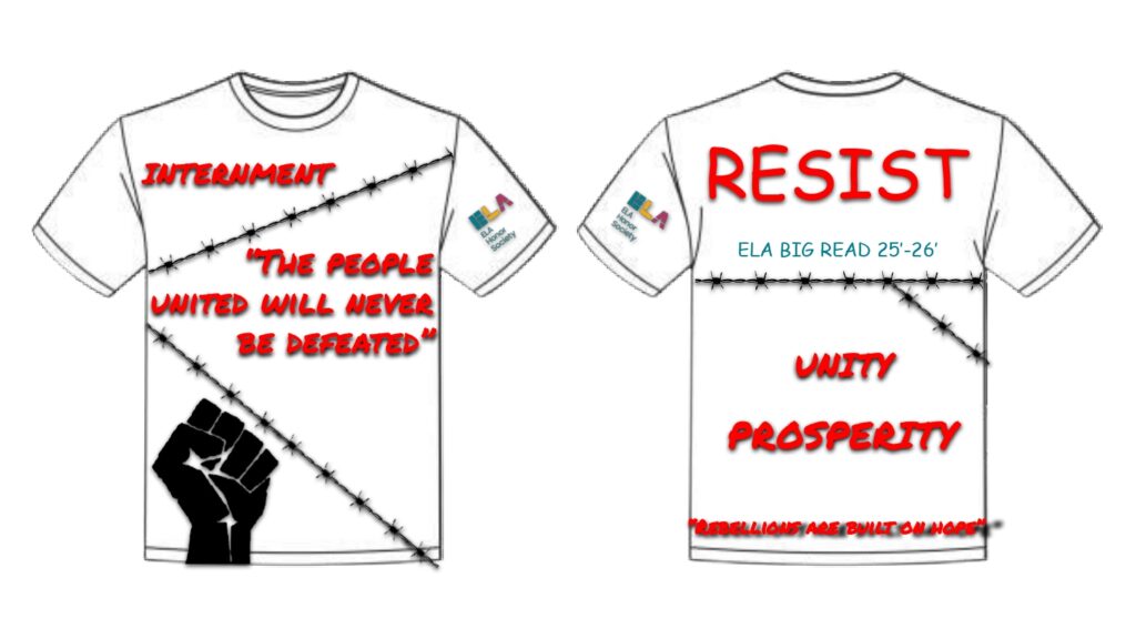 Hannah Jaquin of Morgan Road Middle School in New York is the winner of this year’s T-Shirt Design Award for her striking design inspired by Samira Ahmed’s Internment. Her work translates the novel’s themes of resistance, freedom, and justice into a bold visual statement, using symbolic imagery and memorable lines from the text to capture the spirit of Layla’s fight. Designed to be both eye-catching and meaningful, Hannah’s winning entry reflects a thoughtful engagement with literature and a strong artistic vision that resonated with the judges.