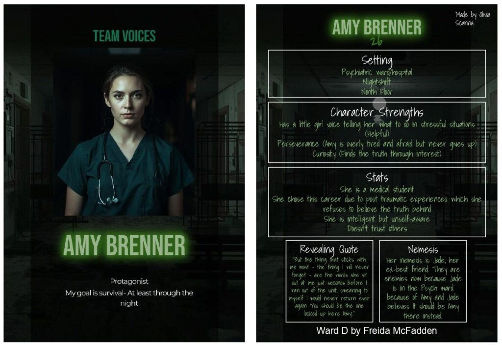 Over the past couple of months, I have become a huge fan of Freida McFadden. She has authored some incredible stories but by far this is my favorite. Ward D has so many twists and turns and has so much suspense along with unexpected events. While reading I can’t even count how many times my face dropped and I gasped. I knew I had to highlight Amy Brenner. She does so many things that no one would expect to happen. My card shows how she can be unexpected but also very predictable. Amy has many different traits to her. She starts out very innocent and makes the reader believe that she could never have done anything but as you keep reading, your perspective on her will change.